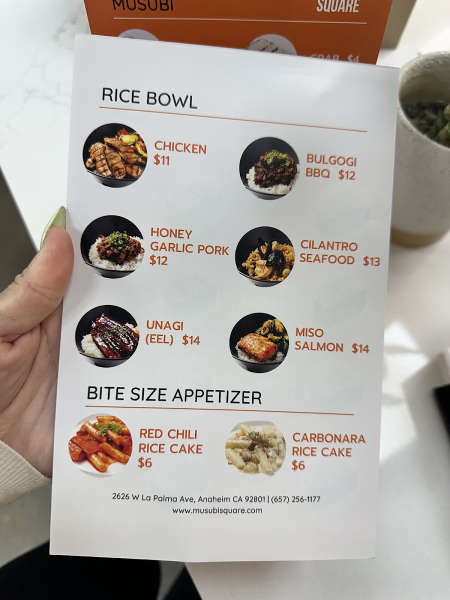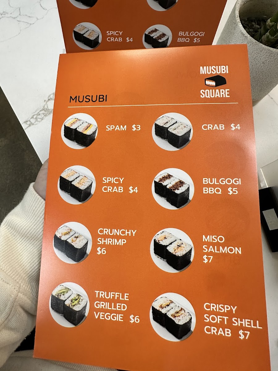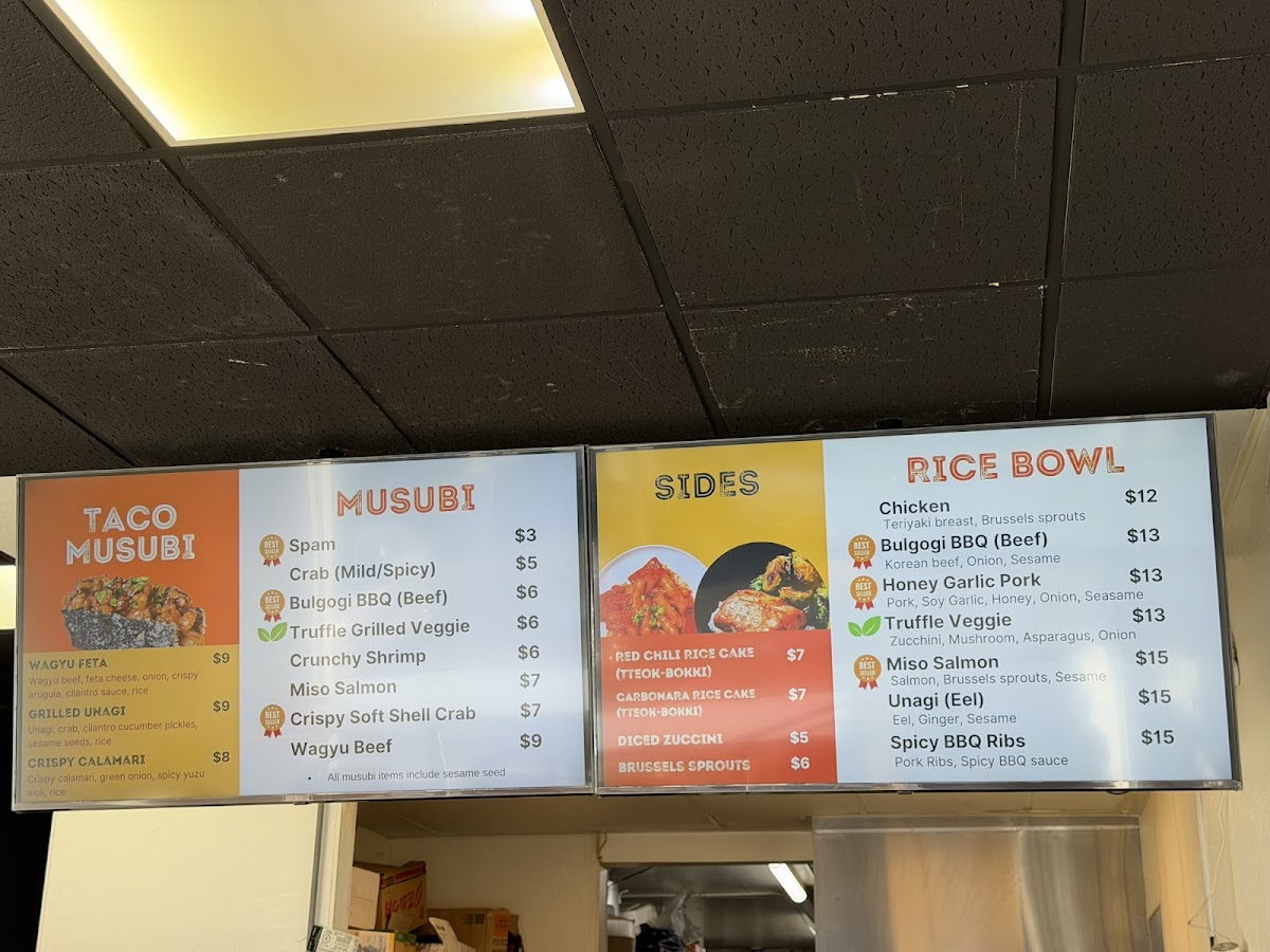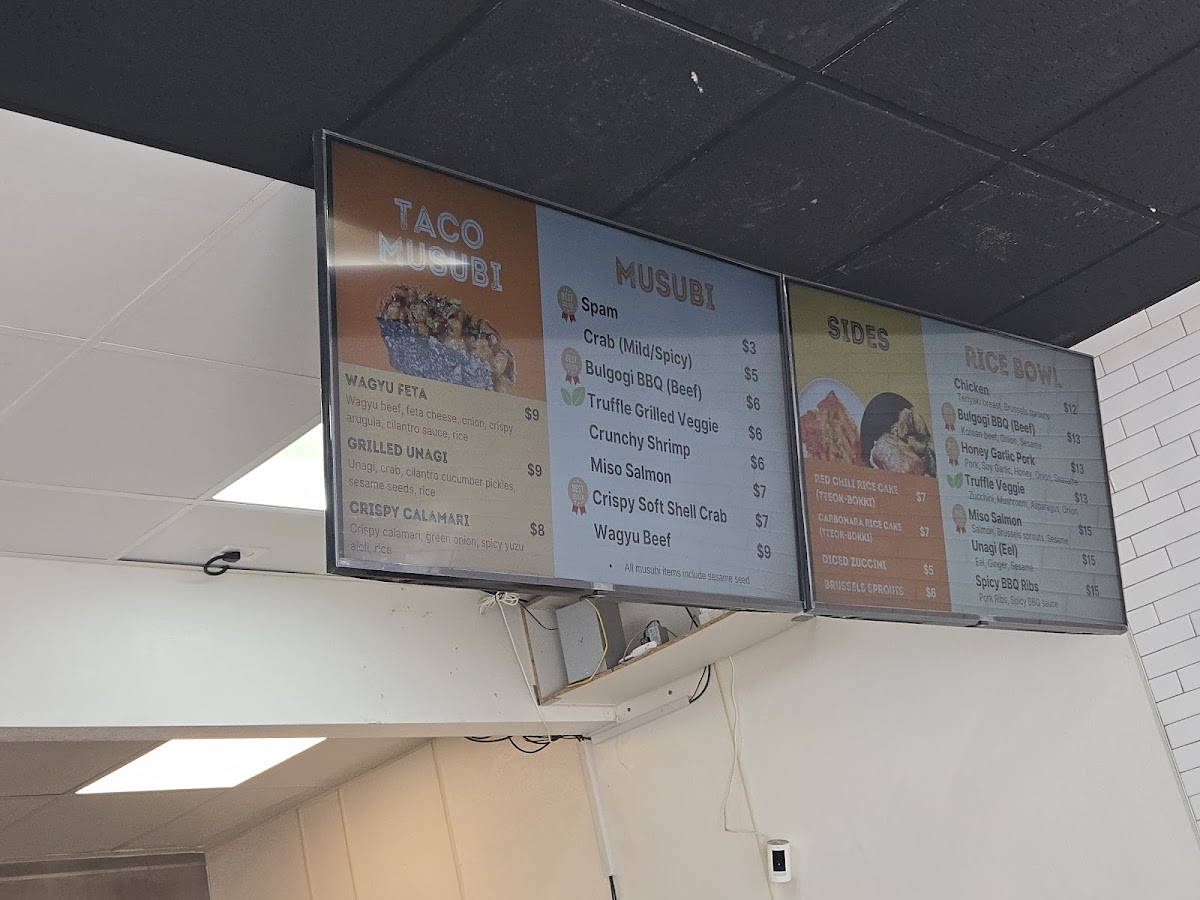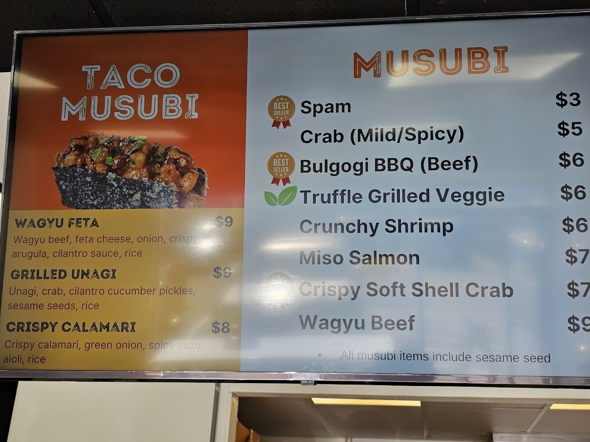 From a reviewer’s perspective, the menu at Musubi Square offers a creative mix of flavors centered around musubi and rice bowls, with a variety of satisfying options across categories. The drinks selection is simple, including Soda, FIJI WATER, Sparkling Water Bottle Ramune, and Iced Tea, which pair well with their savory dishes. The rice bowl section stands out with options like Truffle Grilled Veggie Bowl (Vegan), Honey Garlic Pork, Spicy BBQ Ribs, Miso Salmon Bowl, and Unagi (Eel), offering both plant-based and protein-rich choices. For smaller bites, appetizers such as Diced Zucchini, Brussel Sprouts, Red Chili Rice Cake (Tteok-Bokki), and Carbonara Rice Cake (Tteok-Bokki) add variety and bold flavors. The Taco Musubi selection is unique, featuring items like Grilled Unagi Taco, Crispy Calamari Taco, and Wagyu Feta Taco, blending Japanese and fusion influences. Classic musubi options like Wagyu Beef, Bulgogi BBQ (Beef), Spam, Spicy Crab, and Truffle Grilled Veggie round out the menu, giving customers a wide range of choices that balance traditional musubi with modern, upscale ingredients, making the menu both approachable and interesting for different tastes.