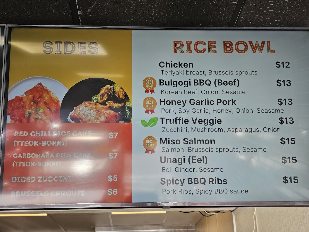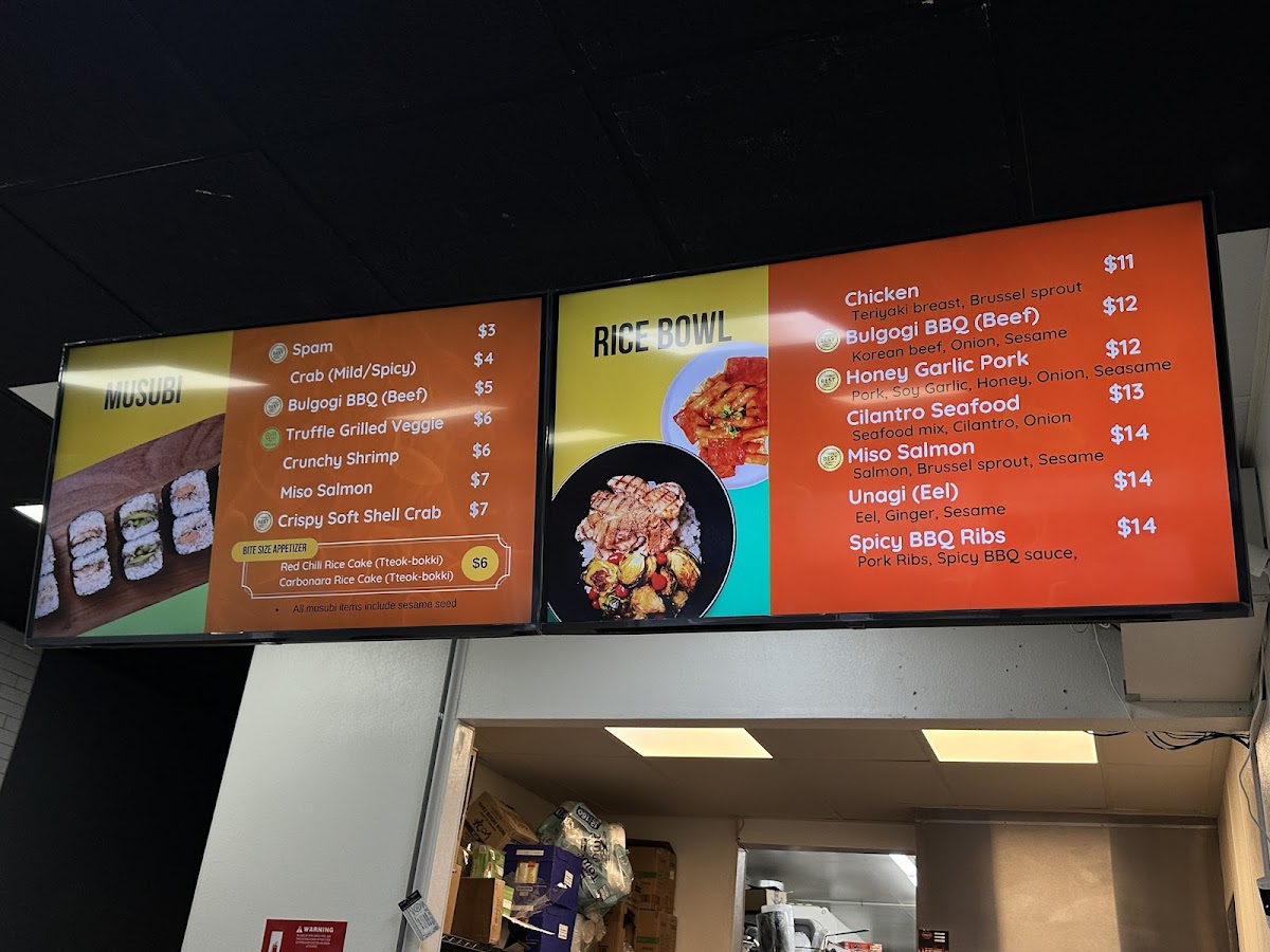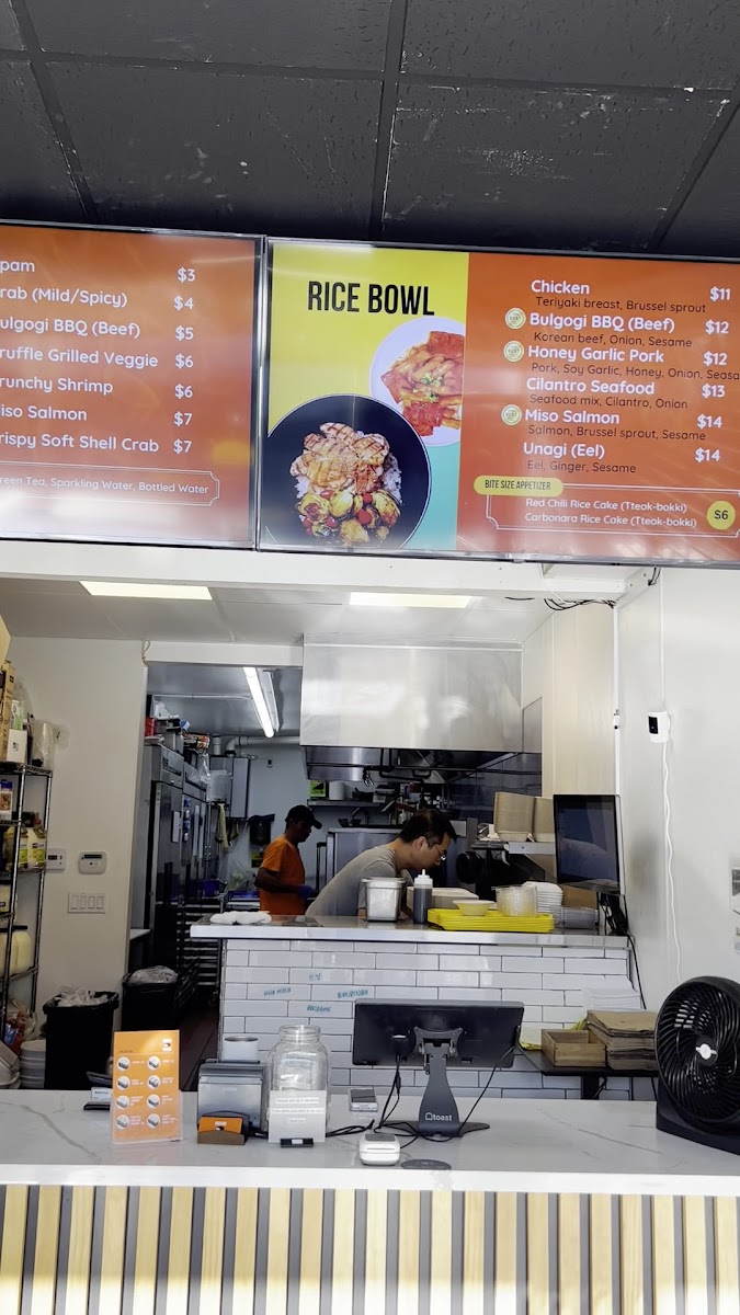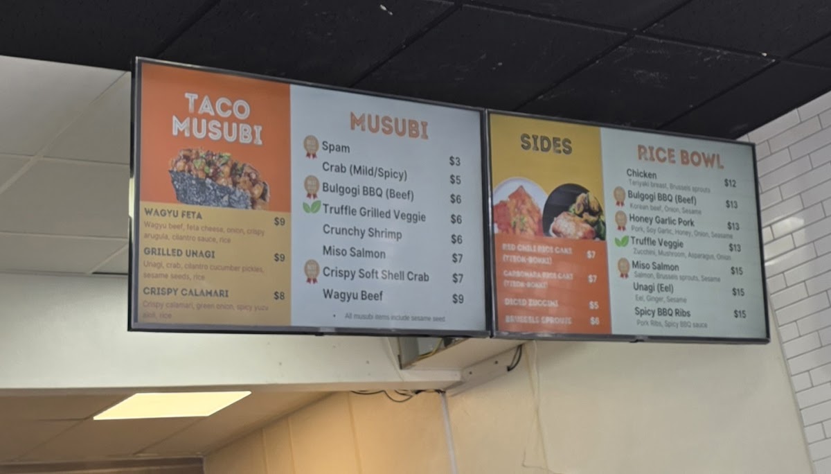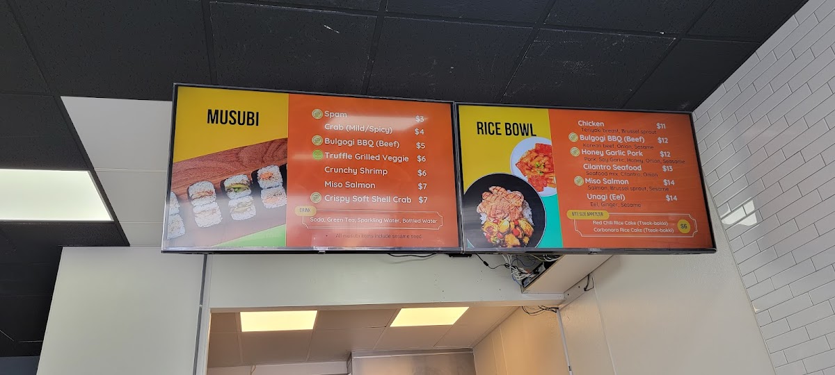 From a reviewer’s perspective, the menu at Musubi Square offers a creative mix of flavors centered around musubi and rice bowls, with a variety of satisfying options across categories. The drinks selection is simple, including Soda, FIJI WATER, Sparkling Water Bottle Ramune, and Iced Tea, which pair well with their savory dishes. The rice bowl section stands out with options like Truffle Grilled Veggie Bowl (Vegan), Honey Garlic Pork, Spicy BBQ Ribs, Miso Salmon Bowl, and Unagi (Eel), offering both plant-based and protein-rich choices. For smaller bites, appetizers such as Diced Zucchini, Brussel Sprouts, Red Chili Rice Cake (Tteok-Bokki), and Carbonara Rice Cake (Tteok-Bokki) add variety and bold flavors. The Taco Musubi selection is unique, featuring items like Grilled Unagi Taco, Crispy Calamari Taco, and Wagyu Feta Taco, blending Japanese and fusion influences. Classic musubi options like Wagyu Beef, Bulgogi BBQ (Beef), Spam, Spicy Crab, and Truffle Grilled Veggie round out the menu, giving customers a wide range of choices that balance traditional musubi with modern, upscale ingredients, making the menu both approachable and interesting for different tastes.